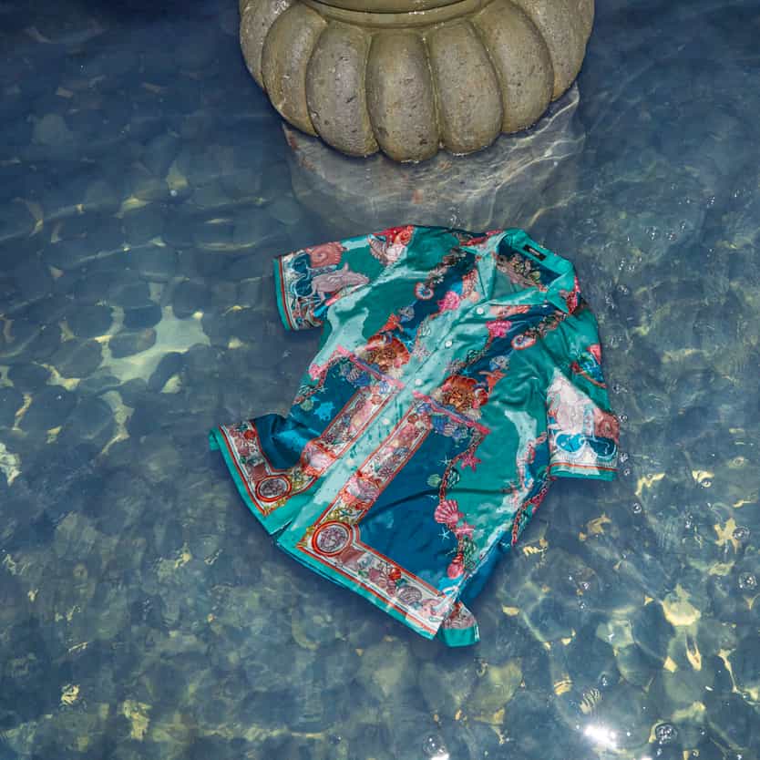 This season, the Versace woman moves effortlessly between beach and boulevard. Draped swimwear evolves into structured bustiers; lightweight pareos become sheer, buttoned dresses. Signature cowl necklines flow into liquid silhouettes, accented with the iconic safety pin. Across poplin, jersey and silk, the House’s emblematic prints reappear—reimagined in airy cardigans, fluid shirts and sculptural jackets.