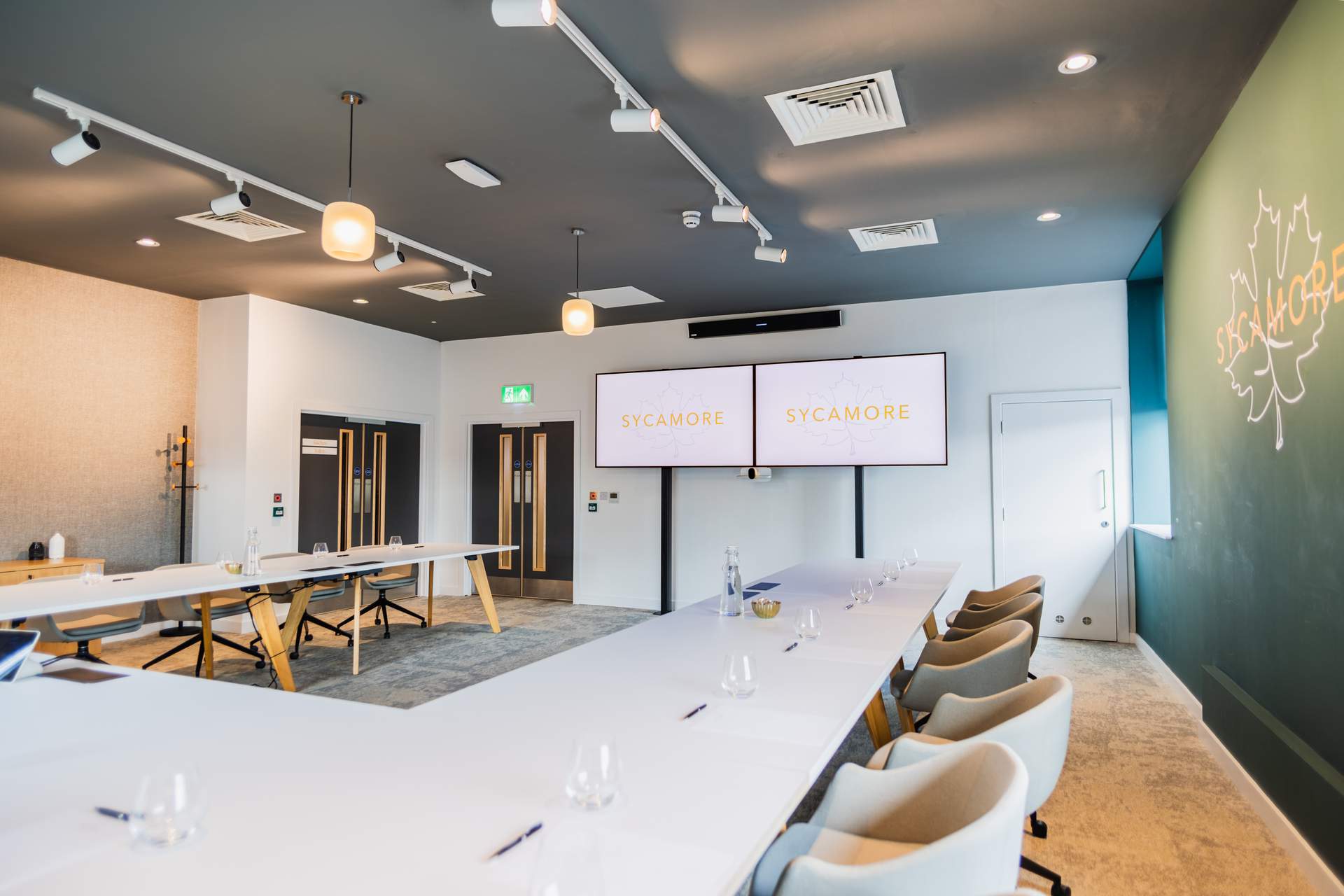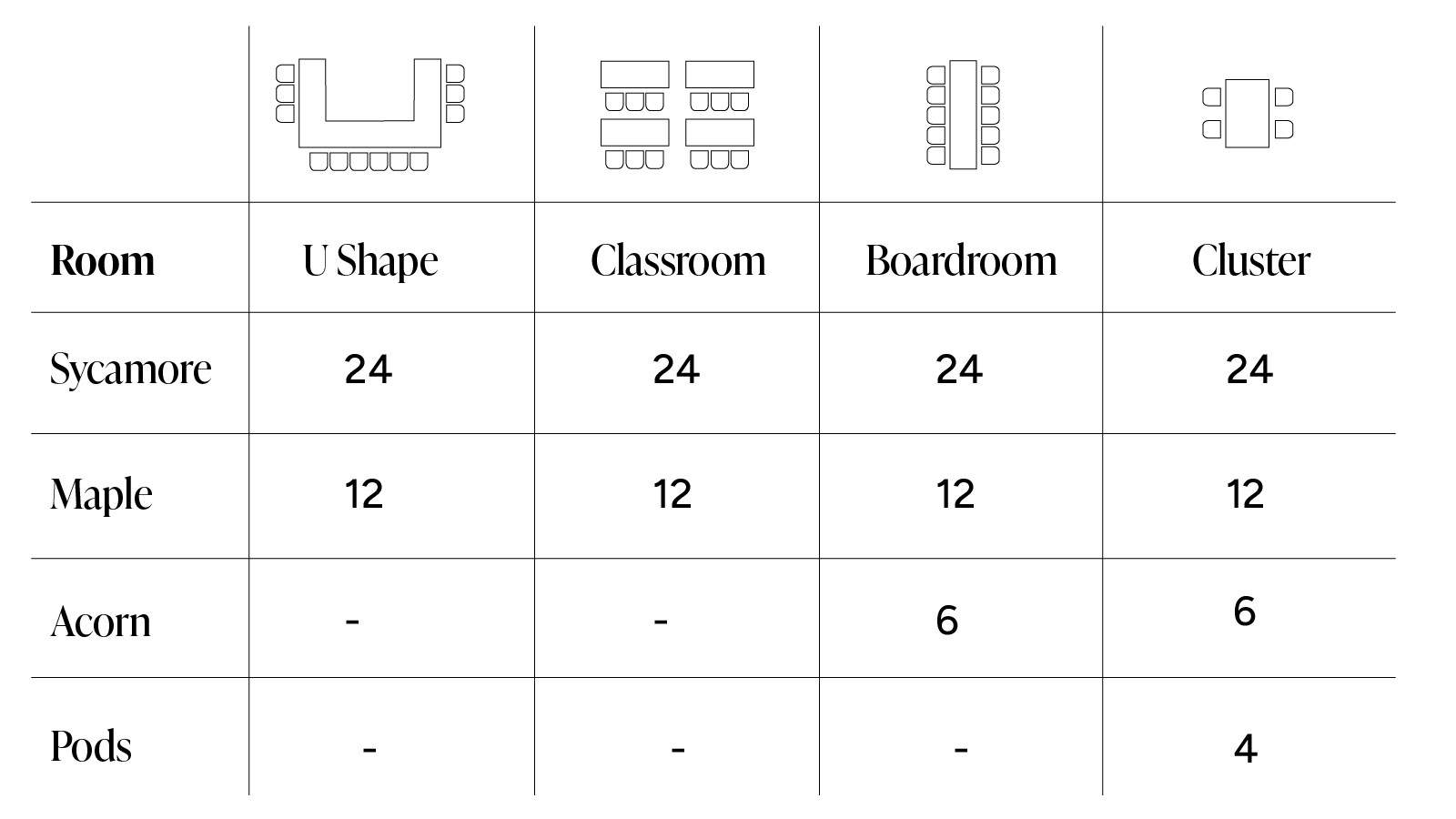 The Sycamore meeting room is the ideal choice for medium-sized gatherings, offering comfortable seating for up to 24 people. Whether you're hosting a workshop, team meeting, or a client presentation, Sycamore provides the perfect setting for collaboration and productivity.