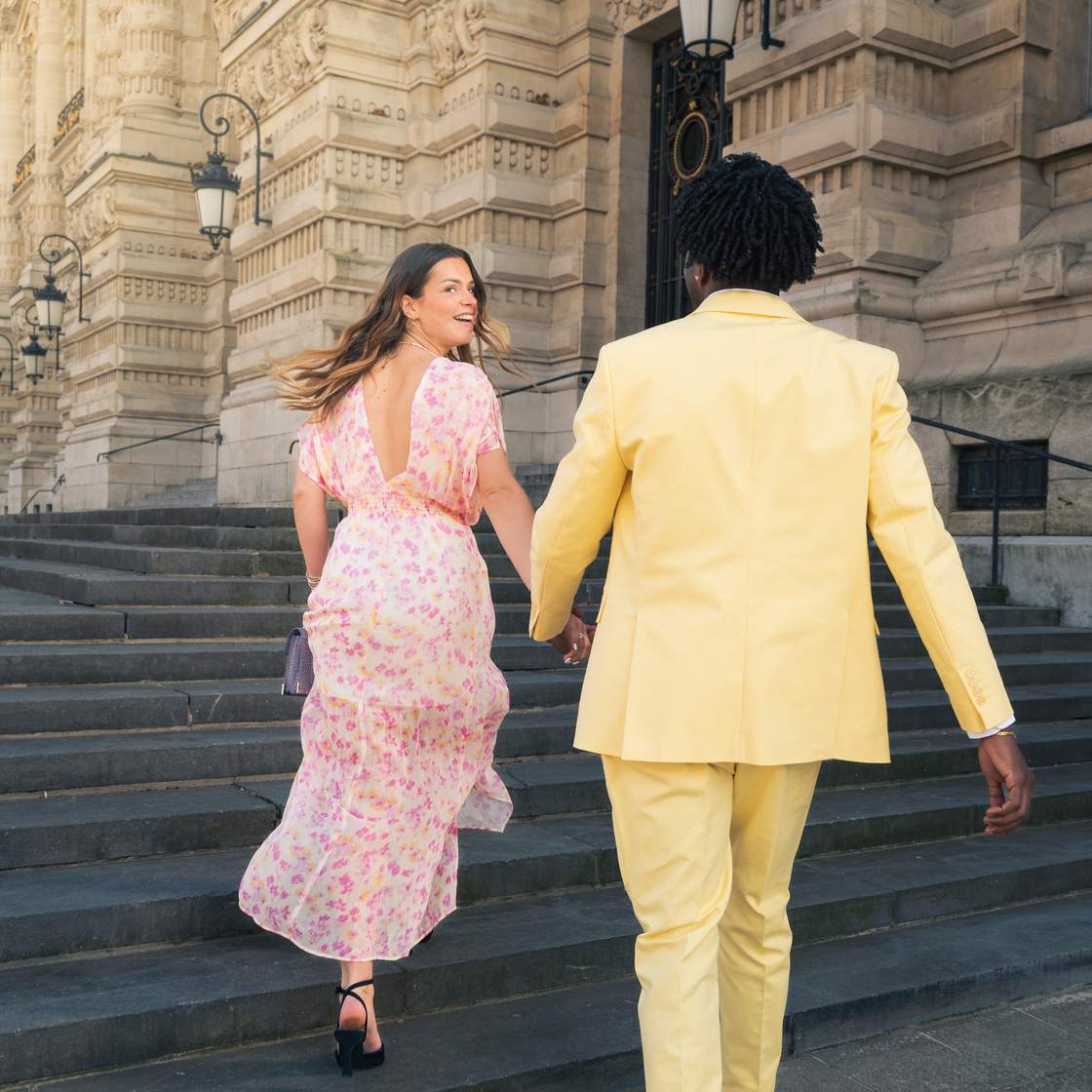 This season, dare to wear pastel tones. Powder pink, butter yellow, sky blue… Romantic colours that will brighten your ceremony looks. Fall for this Tara Jarmon dress or this Maje tailored suit, for example. Terracotta shades, like this Maison 123 dress, will also be part of the celebration this season.