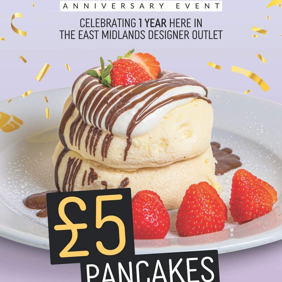 Unisciti a Fluffy Fluffy questo sabato 28 marzo per dei pancake da £5 mentre festeggiano un anno intero all'East Midlands Designer Outlet!