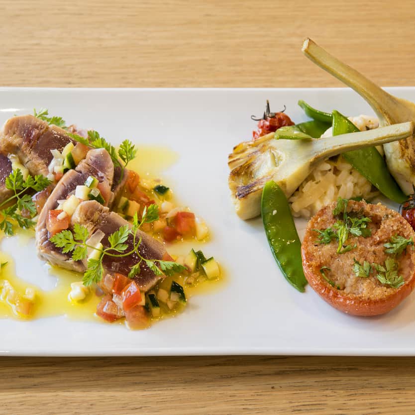 In warmer months, enjoy house-made salmon gravlax with guacamole, strawberry salads, and exquisite desserts crafted by Philippe Urraca, Meilleur Ouvrier de France.