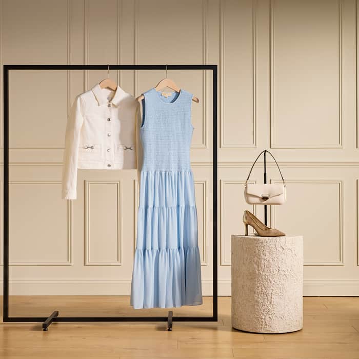 As we enter the season of al fresco dining and sun-dappled soirées, the question of what to wear to a garden party comes to mind. This Smocked Tank Dress in pastel blue offers a fresh take on a classic design, with its tiered skirt and ruched bodice playing on key SS26 trends of romance and femininity. Soft tones are an obvious choice when temps are higher, and the lightweight fabric and breezy silhouette of this dress make it the perfect choice for a summer outfit. After the sun goes down and the chill sets in, the Carson Denim Jacket is ideal for draping over cold shoulders, and the bright white shade complements the dress beautifully. Pair with the matching shoulder bag and a neutral heel to complete the look. Visit [CENTRE] to find summer occasionwear styles for up to XX% off.